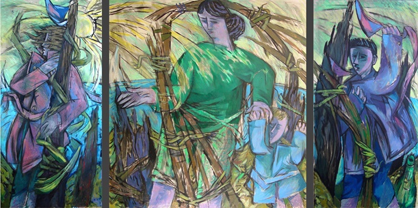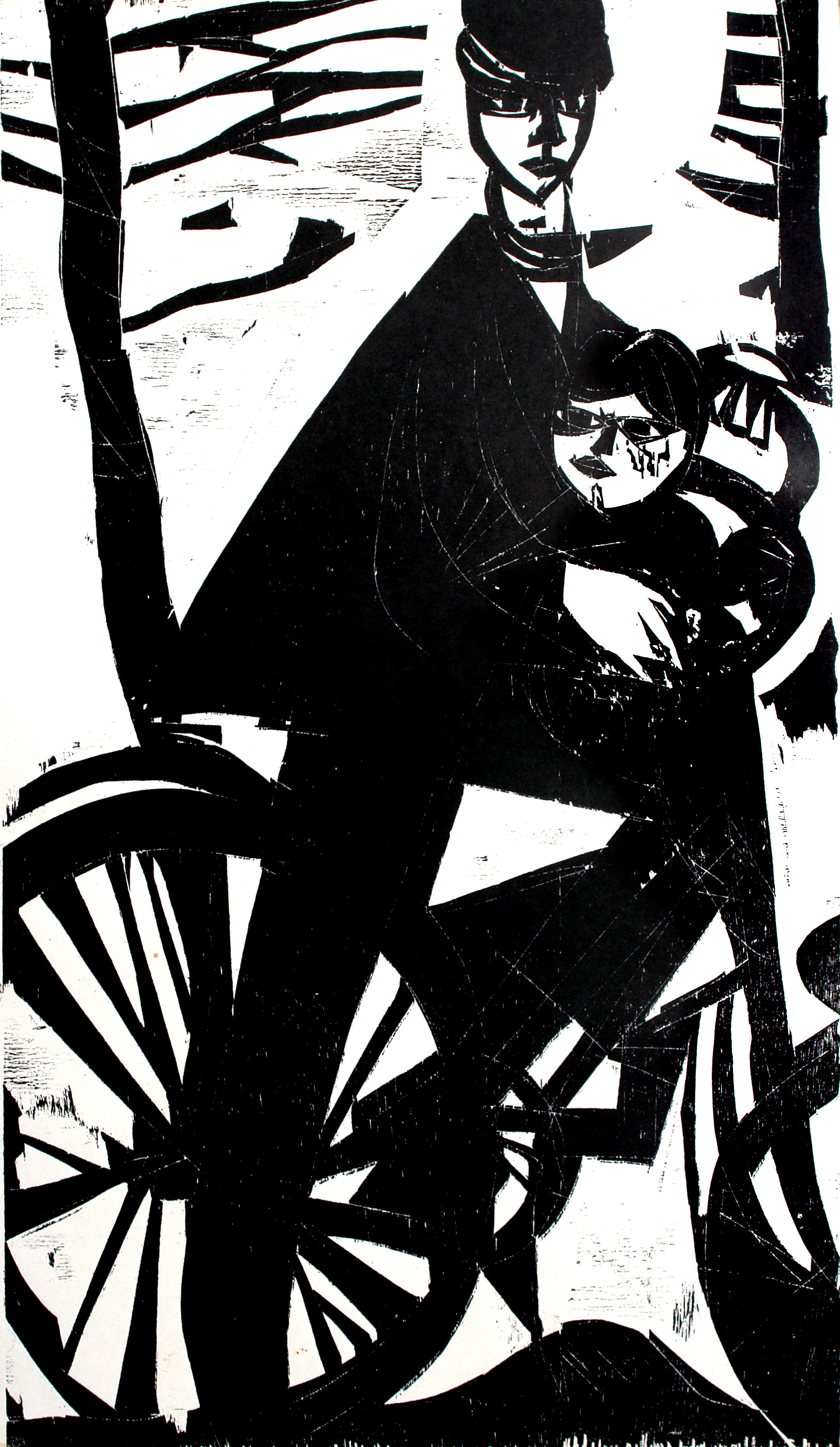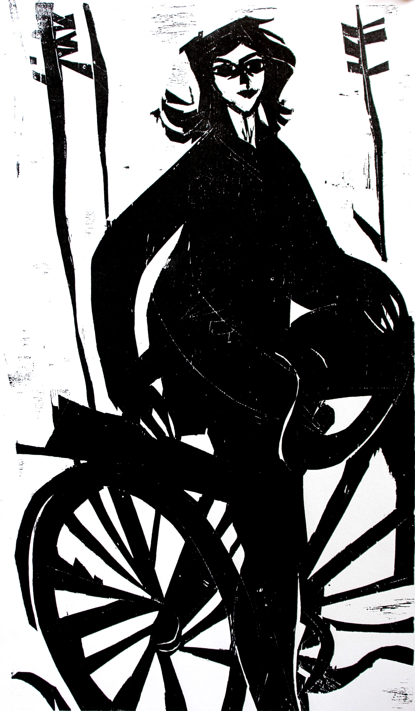 In den 80erjahren finden sich viele Arbeiten, die vom Alltag mit der Familie berichten. Es sind Porträts und auch größere Arbeiten, in denen komplexe Themen bearbeitet werden. Da entstehen die herrlichen Holzschnitte mit den Familienmitgliedern auf dem Fahrrad und die Strandtriptychen, in denen auch etwas Krisenhaftes aufscheint.