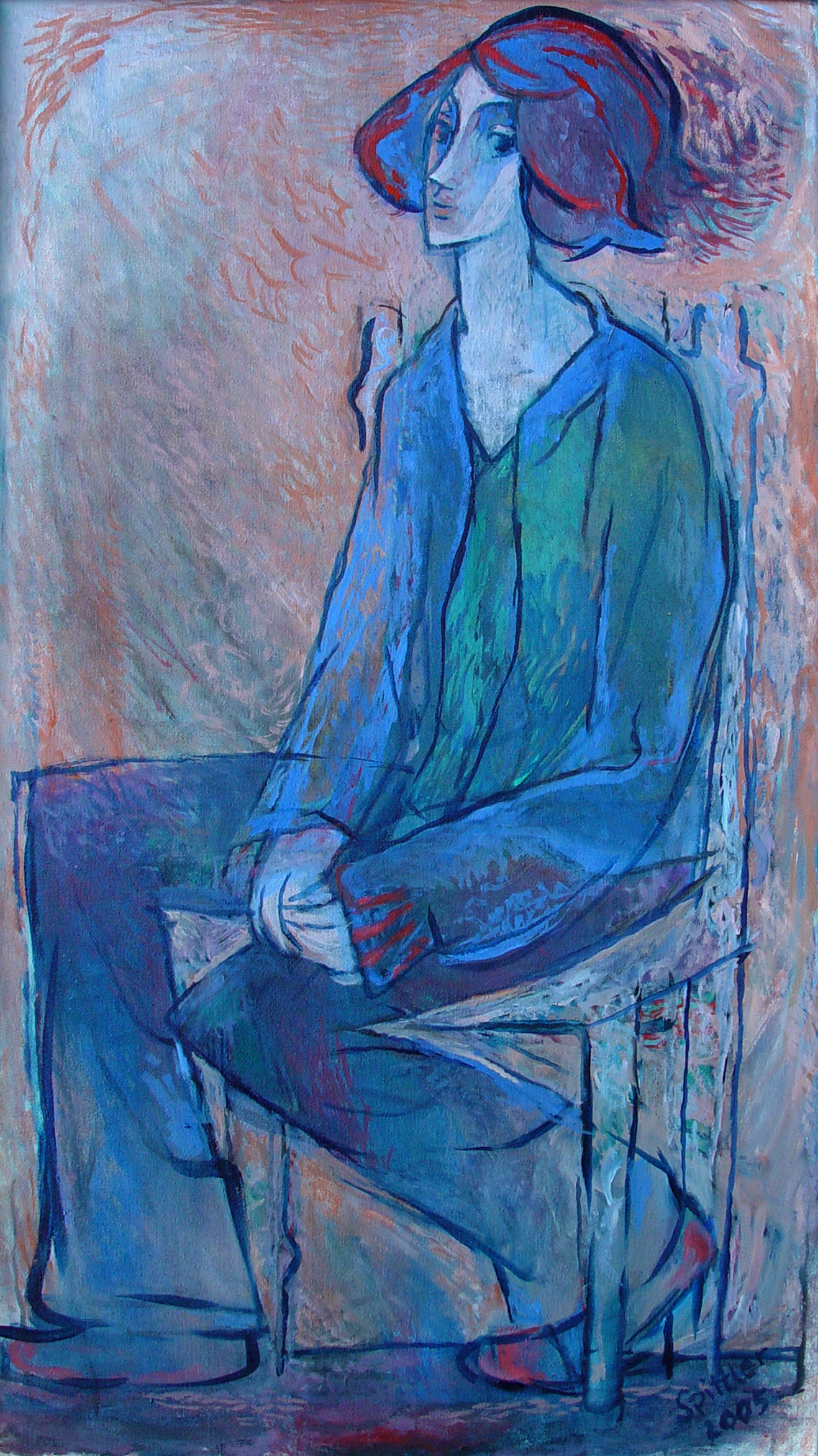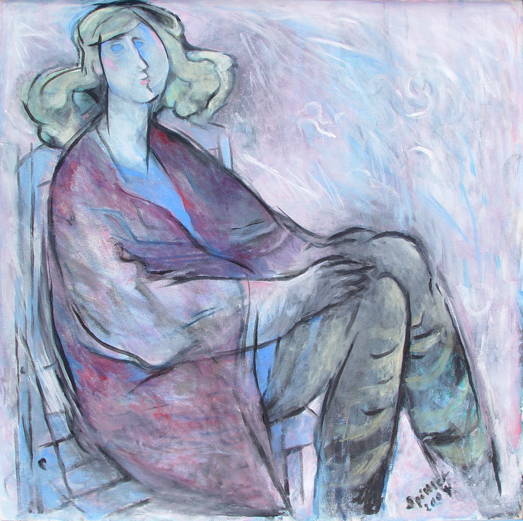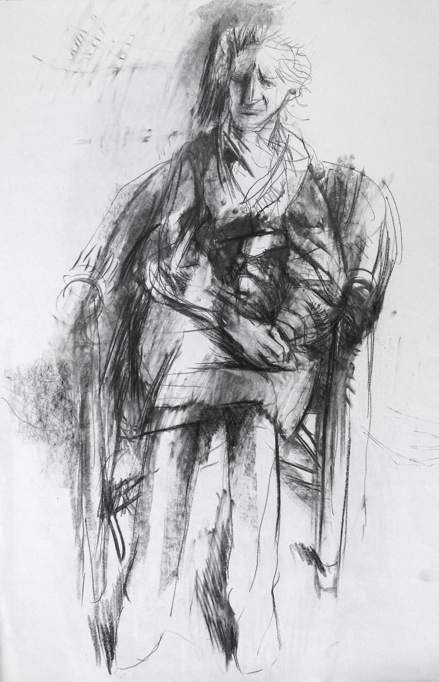 Zu den Familien- und Freundesporträts gehört auch „Tante Ria“ (1986). Hier überwiegt die grafisch-konstruktive Auffassung, eine stellenweise beinahe kubische Auflösung. Dadurch gelingt es, das steife Sitzen der alten Dame und zugleich eine innere Unrast darzustellen, etwa durch die sich fast verselbstständigenden Linien um Hals und Kopf und andere grafische Spuren im Spannungsfeld von Form und Ausdruck. Sie geben dem Porträt tieferen Sinn und dem Betrachter einen Interpretationsraum. Die im gleichen Jahr entstandene farbige Fassung betont dagegen die Ordnung der Flächen. Die Figur bekommt ein räumliches Ambiente, das in seinem starken Anschnitt vielleicht die geringer gewordene Bewegungsfreiheit einer einst agilen Dame zeigen soll. Zugleich erscheint sie statuarischer als in der Zeichnung.