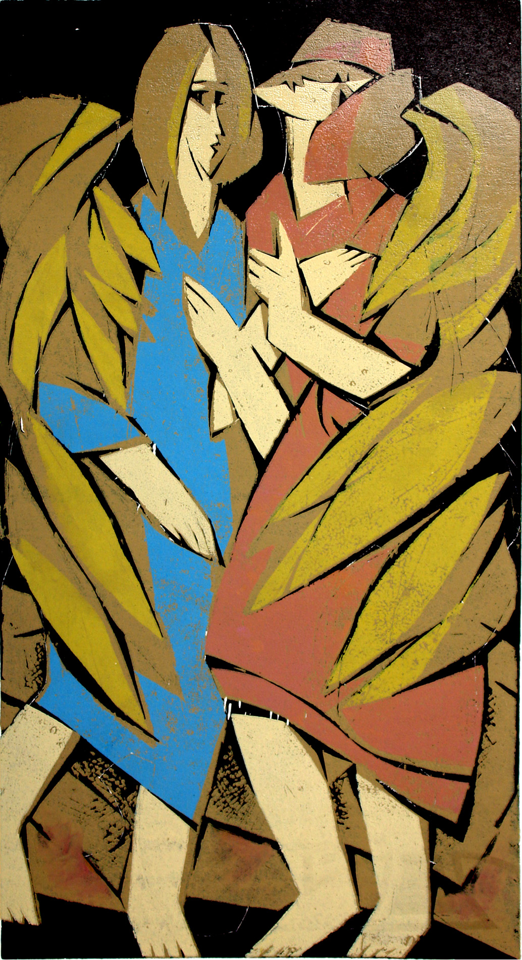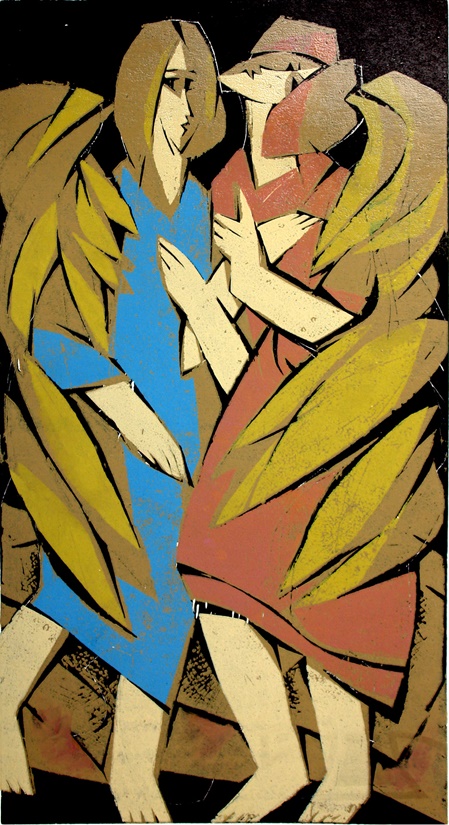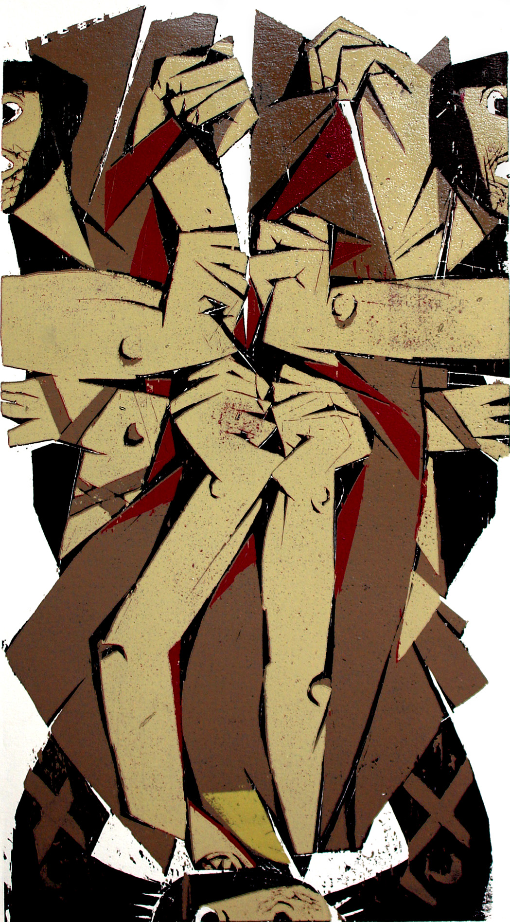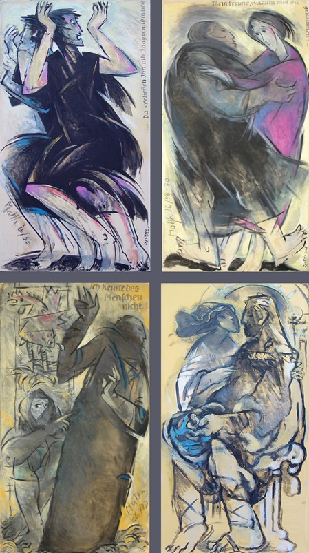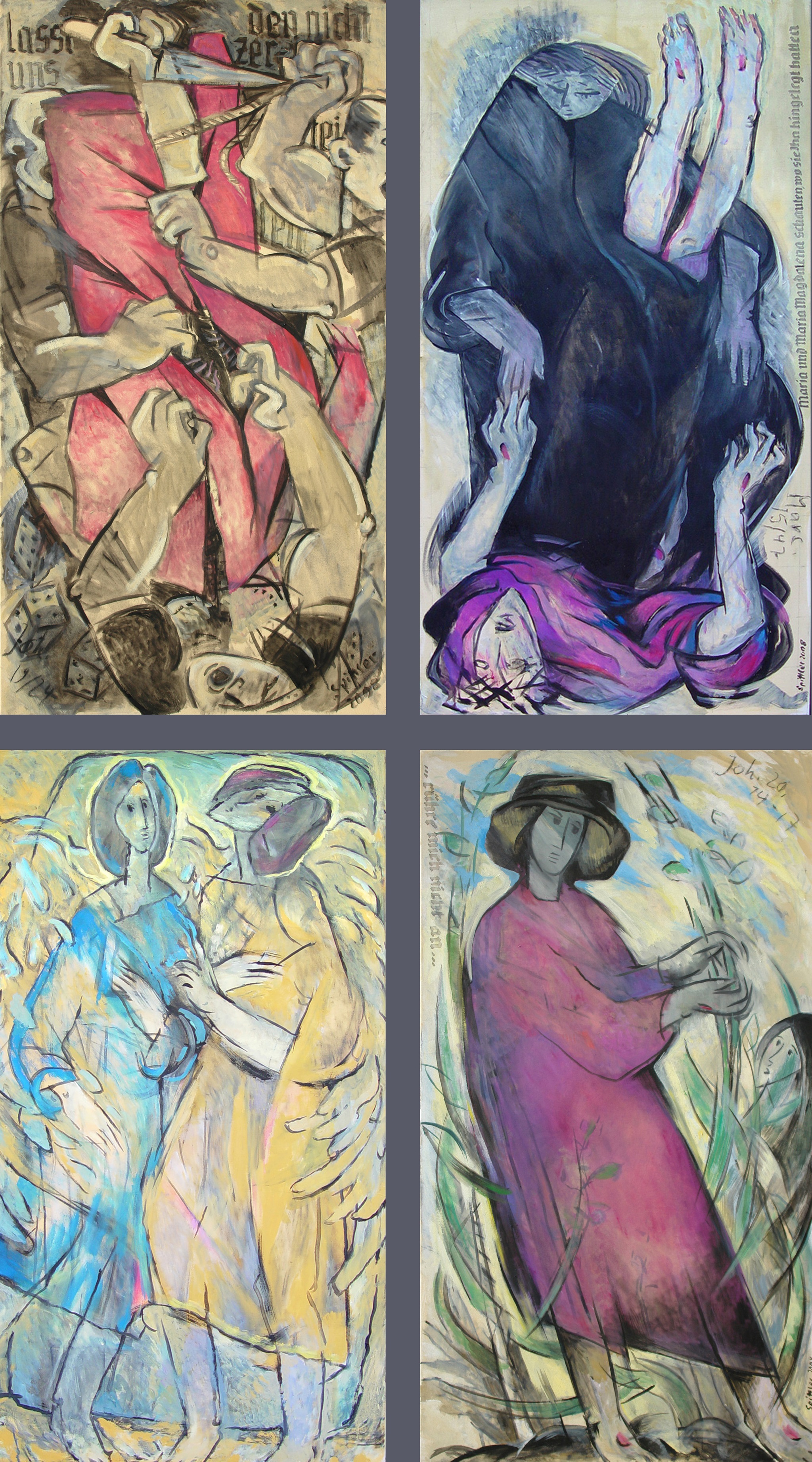 In den durch das Hochformat bereits spannungsgeladenen Bildern fällt die verdichtete Energie auf, die von ihnen ausgeht. Die Figuren stemmen sich geradezu gegen den Rand, werden gegen den Rand gedrückt, fallen vom Rand her ein oder schwingen in den letzten beiden Motiven in gemäßigtem Abstand zu ihm. Es sind radikale Kompositionen, die die Motive in ihrer existenziellen Bedeutung unterstreichen. Die fliehenden Jünger müssen nach links aus dem Bild herausdrängend alle Kraft aufbringen. Der Judaskuss erscheint wie ein Kampf zwischen Freunden, in Abwehr und Annäherung zugleich. Dann die Kriegsknechte, mit ihren enormen Armen und Händen sieht man sie am purpurnen Mantel zerren. Wie ein Stakkato greifen Hände und Fäuste in einem ewigen Kreislauf brutal ins Zentrum des Bildes, wo der in grellem Magenta leuchtende Stoff liegt wie ein offene Wunde. Die Gesichter sind von Gewaltlust verzerrt. Und dann die Beweinung, eher ein Sturz des toten Christus, der den Armen der in dunklen Stoff gehüllten Mutter entgleitet. Es ist die Gewalt, die um Christus herum waltet, die hier zum Thema wurde, die roh, kriegerisch, taktisch oder als Freundesverrat daherkommt. Die Engel am Grabe, sind wie zwei Frauen, die aus den anderen Bildern von Wolfgang Spittler in diese Geschichte geraten sind. Ihr engelhaftes Sein wird durch Transparenz und das Durchwirken der Linien und Farbtöne erreicht, sodass sie als Lichterscheinungen erkennbar sind. Bildeinnehmend und doch in weichem Schwung steht der Gärtnerchristus, bezeugend , dass das Leben weiter gehen wird.