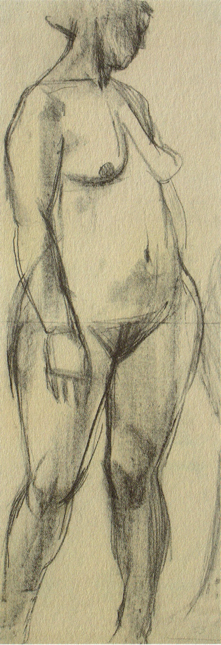 Bald zeigt sich im Werk Wolfgang Spittlers eine Tendenz, die Form als Ganzes zu erfassen und damit einer Figur die innere Bewegung abzulauschen, um ihr im Bild eine dominante Grundstimmung zu geben. Die beiden frühen Zeichnungen (weiblicher Akt von 1953 und Inge von 1954) stehen kraftvoll im Blatt. Die enge Einbindung in das Blattgeviert gibt ihnen eine je besondere Spannung. Die Drehung oder Wendung des Körpers verwandelt den Blattgrund in den Aktionsraum, in dem die weiblichen Modelle selbstbewusst und selbstbezogen agieren. Konstruktives und Plastisch-Körperliches werden im Akt wunderbar abgewogen, die grafischen Mittel sind mit großer Sicherheit gesetzt. Da sehen wir diesen bewegten und lebendigen Strich, bald fest und dicht, dann offen und von weiteren Linien umgeben, der ohne ornamentale Umschreibungen Form und Volumen schafft. Er wird auch weiterhin typisch für den Künstler bleiben. Ebenso die großflächig gezogenen und dennoch präzise Plastizität formenden Schatten. In der Kohlezeichnung „Inge“ ist es das lose und schwungvoll den Körper umspielende Kleid, das mit nur wenigen gestisch wirkenden Strichen angedeutet ein luftiges Volumen schafft.