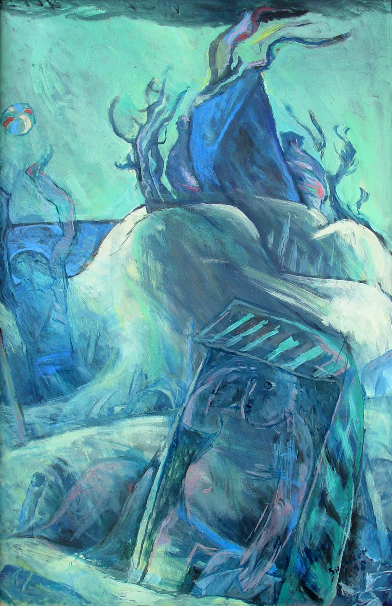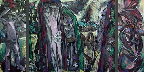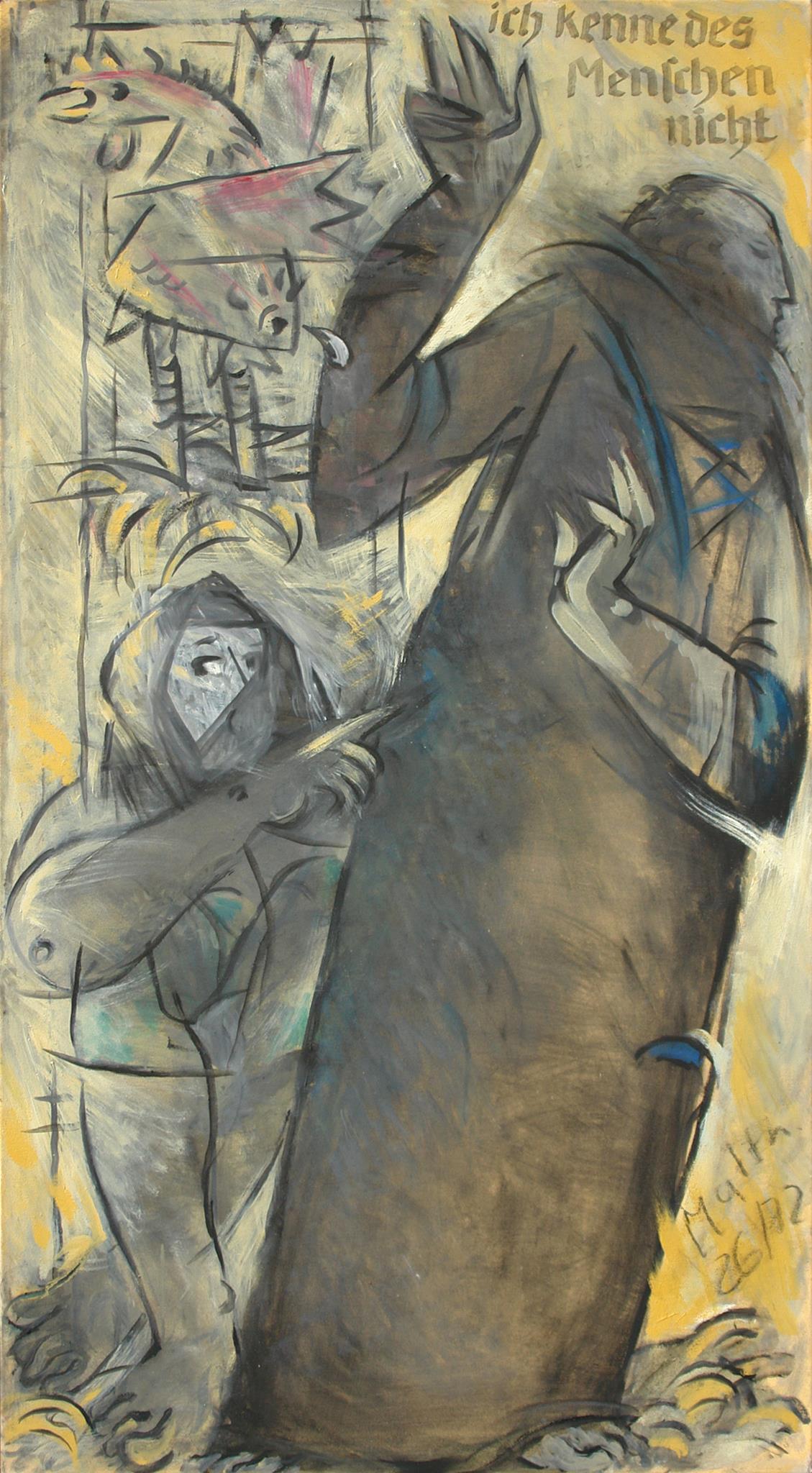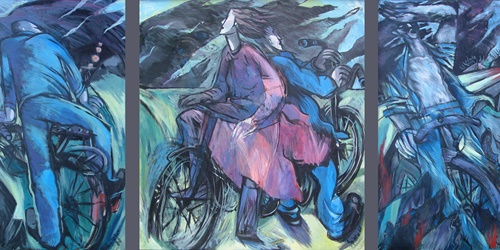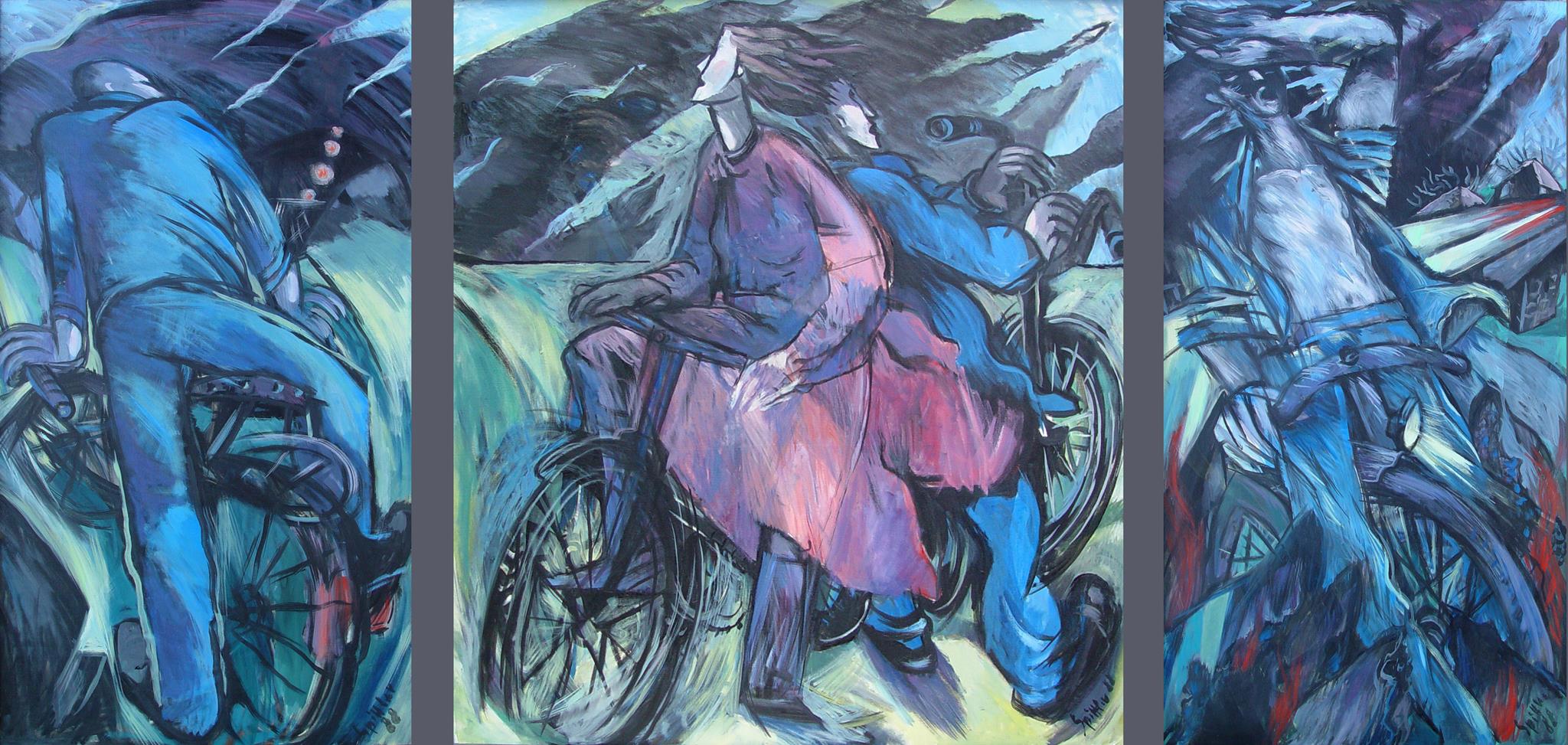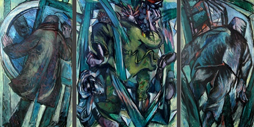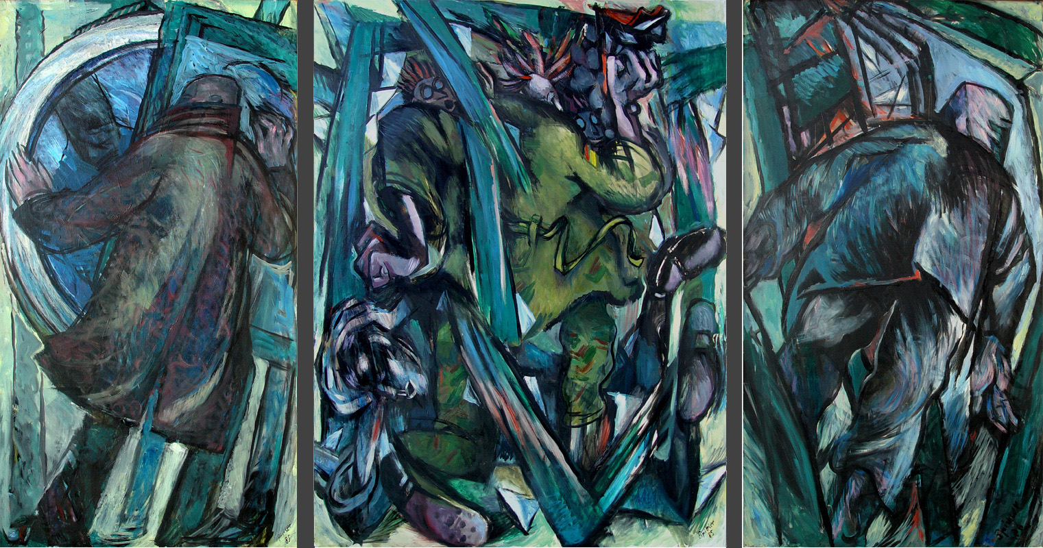 "Diese Gruppe der großformatigen Triptychen bringt eine Erweiterung der Bildsprache und des inhaltlichen Anspruchs hervor, indem teils verrätselt, teils offenbarend komplexe Inhalte mit bedeutsamen Metaphern zum Ausdruck gebracht werden."